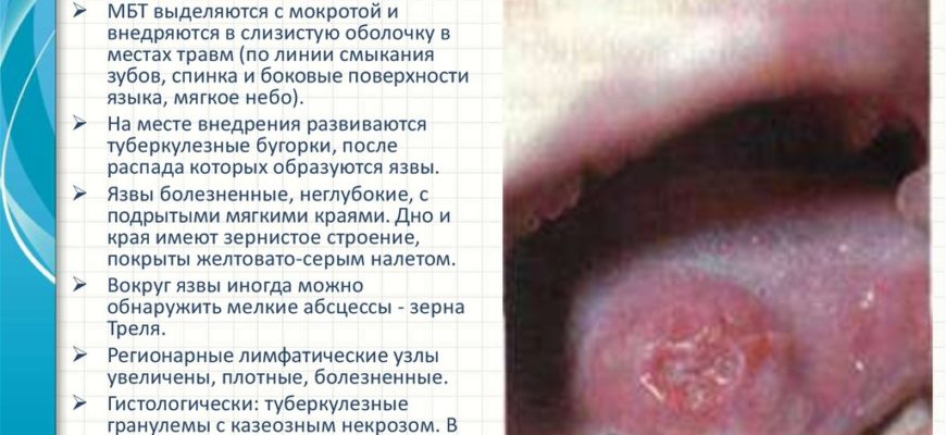 У больных туберкулезом легких инфекция слизистой оболочки полости рта вызывается проникновением микобактерий из мокроты. Общее снижение иммунитета, воспаления, микротрещины и другие травмы на слизистых оболочках способствуют проникновению патогенных микроорганизмов на слизистые оболочки.