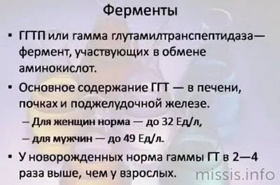 Норма гамма-глутамилтранспептидазы у мужчин и женщин различна. Нормы у детей выше, чем у взрослых, и коррелируют с возрастом. С двенадцати лет уровень фермента становится таким же, как у взрослых.