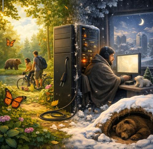 «Интернет в России должен подстраиваться под сезонные циклы медведей и бабочек. Летом его нет, потому что есть жизнь. Зимой в берлоге, или свернувшись червем в высокоэтажном хосписе, можно и в интернете. Виртуальный мир как сны зимней спячки», — отмечает он.