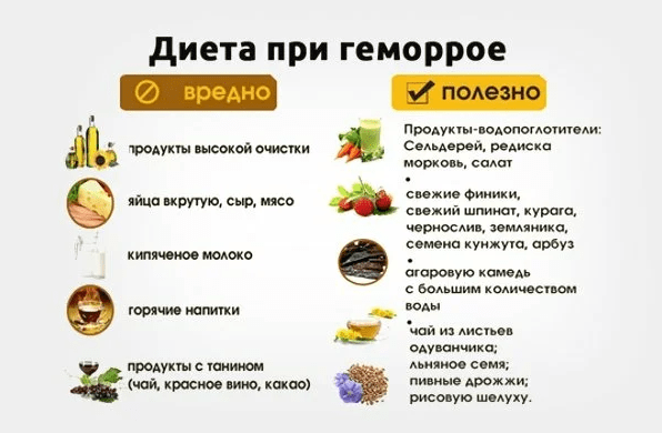 Диета должна быть полностью исключены алкоголь, коктейли, никотин и фаст-фуд. Продолжительность таких ограничений — в месяце, а потом врач обращает индивидуальное меню для каждого пациента с пожизненными ограничениями в зависимости от физиологических особенностей организма, причин геморроя.