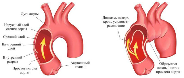 Чаще всего развитие аневризмы заканчивается разрывом интинима в направлении, согласующемся с направлением кровотока. В этом случае формируется ложный и реальный свет.