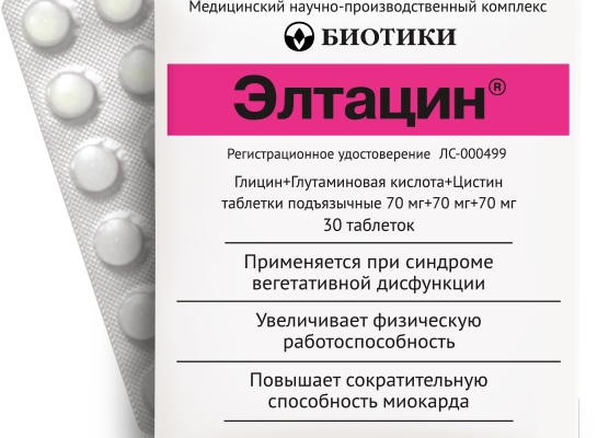 Элтацин — комбинированный препарат, содержащий глицин, цистин, глутаминовую кислоту по 70 мг и вспомогательные вещества. Каждый из ингредиентов оказывает свое уникальное воздействие на головной мозг, что позволяет использовать этот препарат при нарушениях вегетативной нервной системы.