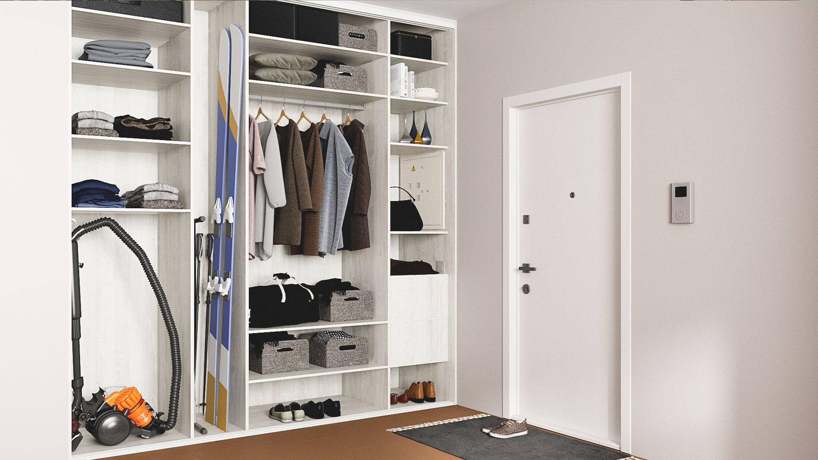 Внутреннее наполнение встроенного шкафа должно быть максимально функциональным и соответствовать вашим потребностям. Вот несколько полезных элементов:
